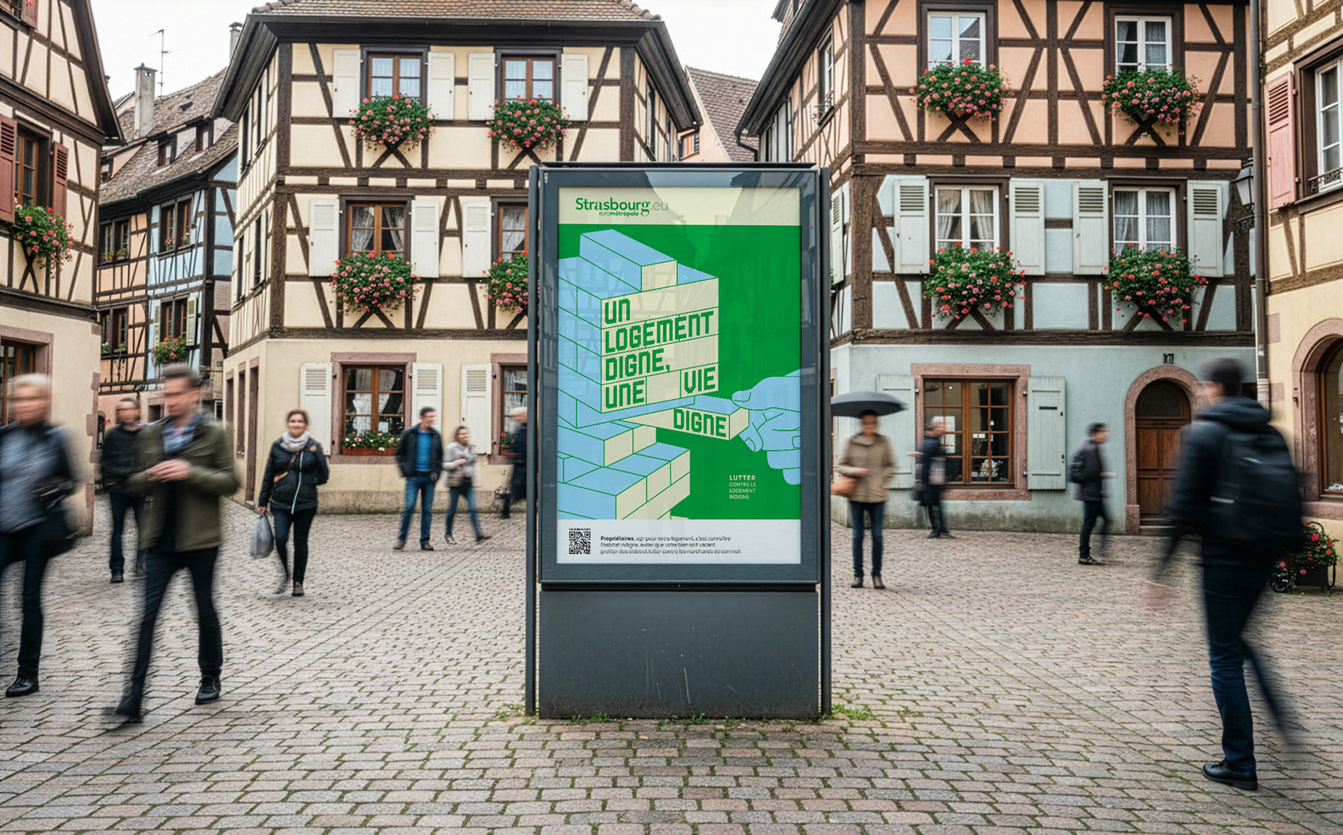 Visual concept developed for a cross-media campaign focused on substandard housing in Strasbourg. Through print and digital formats, the design uses clear messaging and bold visual contrasts to raise awareness about unsafe living conditions and support the right to dignified housing.